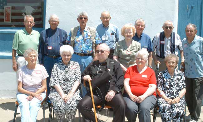 LEFT TO RIGHT, FRONT ROW: Mary Jean Plaisted Price, Irene Riley Smitheran, Victor Hines, Verlie Carpenter Wobker, Rachel Rothe Bauder; BACK ROW: Shorty Waggoner, Albert McKoon, Don Griffin, Doug Estes, Charlotte Bussell Manly, Bill Manly, Claron Cook, Glenn Dale O'Brien |