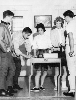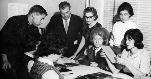 Members of the Yearbook Staff: Jo Nell Peterson, Angela Davis, Dennis Crpenter, Leah Arner, Phyllis Ludwig, Kayleen Platz, and Kay Milne, confer with Mr.Warren Hummer in the selection of a yearbook cover. |