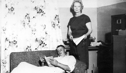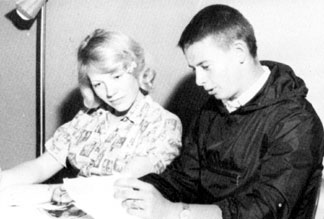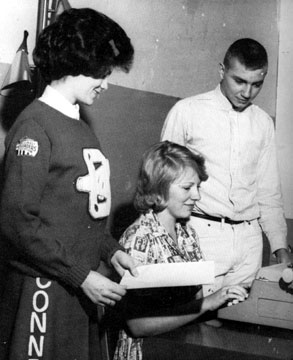 busily types material given her by Connie Gonterman, Associate Editor and Don Byers, Sports Editor. |