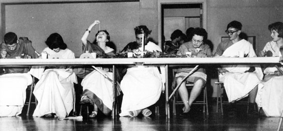 On a snowy December evening, present and former Latin students trudged to the West School to feast on a delicious three-course meal. A staff of eight organized and well informed slaves brought on the meal, consisting of deviled eggs, spaghetti with meat sauce, and apple crisp, which was heartily downed. It had been prepared by the mothers of some of the Roman Trojans. Following the meal was the election by applause of the best-dressed romans. The three skits presented, "Daphne and Apollo", "Ceres and Proserpina", and "The Trial of the Latin language", proved to be very dramatic. The grand banquet concluded with everyone singing the Latin version of some well-known songs. |