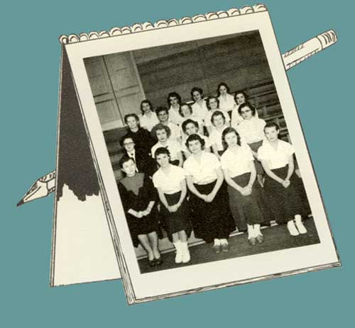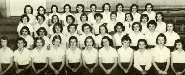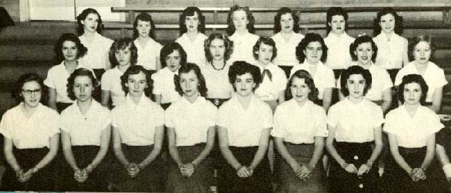LEFT TO RIGHT, FRONT ROW: Miss McClure, Head Sponsor; Marie Ann Haigh, Nancy Hamilton, Marjorie O'Brien, Janet Stanley; SECOND ROW: Miss Brooks, Sponsor; Sandra Buddenhagen, L. Edwards, B. Brewer, J. Jolley; THIRD ROW: Miss Vossler, Sponsor; Sue Hagadorn, J. Johnson, M. Goodeyon, B. Duncan; FOURTH ROW: L. Young, Beverly Casida, S. Parker, Joyce Fowler |