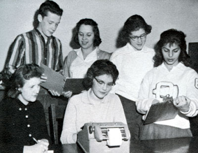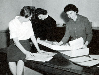 "Let's see, we cleared $190 on our Mr. and Miss. Contest, so we can send our next pages to Topeka today," says Carolyn Burgoon to Sue Ellen Cortner, Business Manager, and her assistants, Louis Mattingly, Pam McGuirk, Carolyn Ray, and Jo Ann Zakoura. |