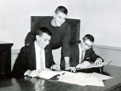 "We'll put the football boys on this page and the basketball boys here," explains James Karigan to Ronnie Renoe and Dale Shaw, members of the Sports Staff. |